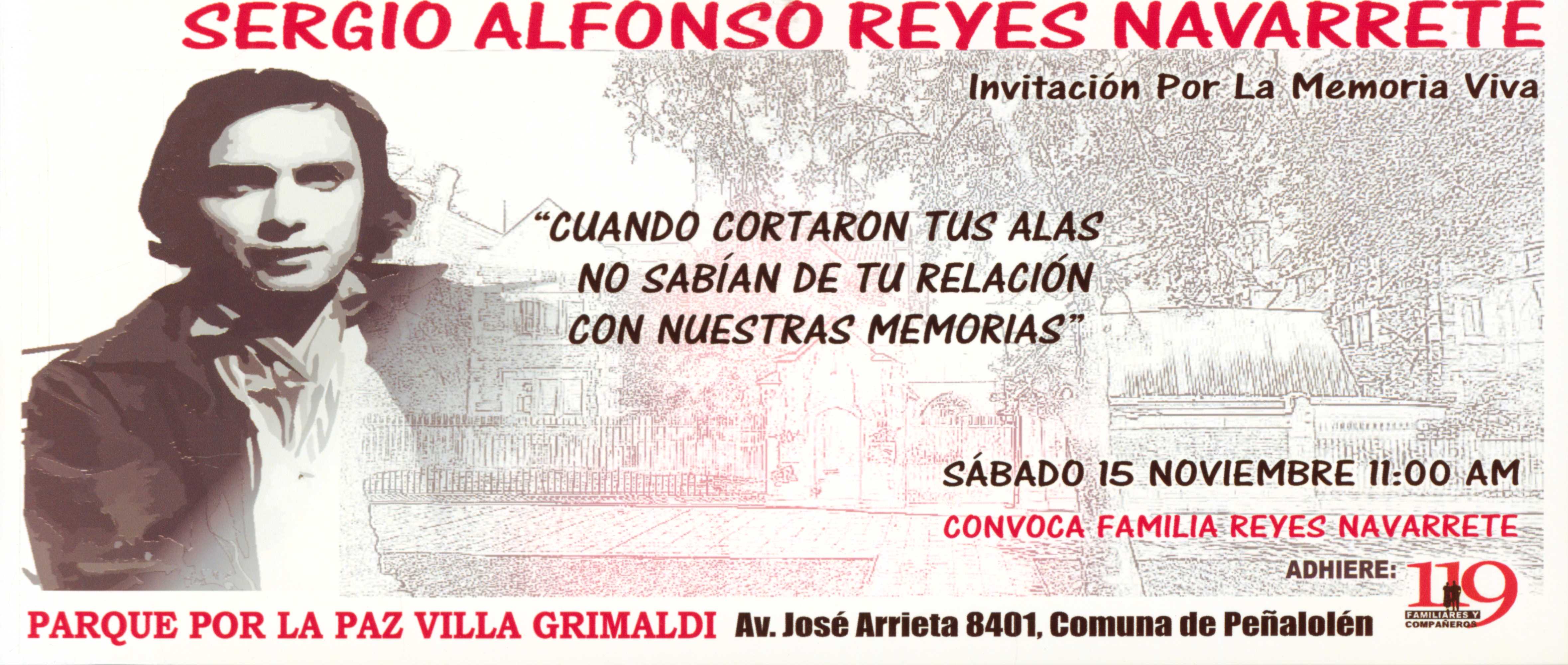 Invitación a acto conmemorativo en honor a Sergio Reyes Navarrete, a realizarse el sábado 15 de noviembre de 2014 en Parque por la Paz Villa Grimaldi.