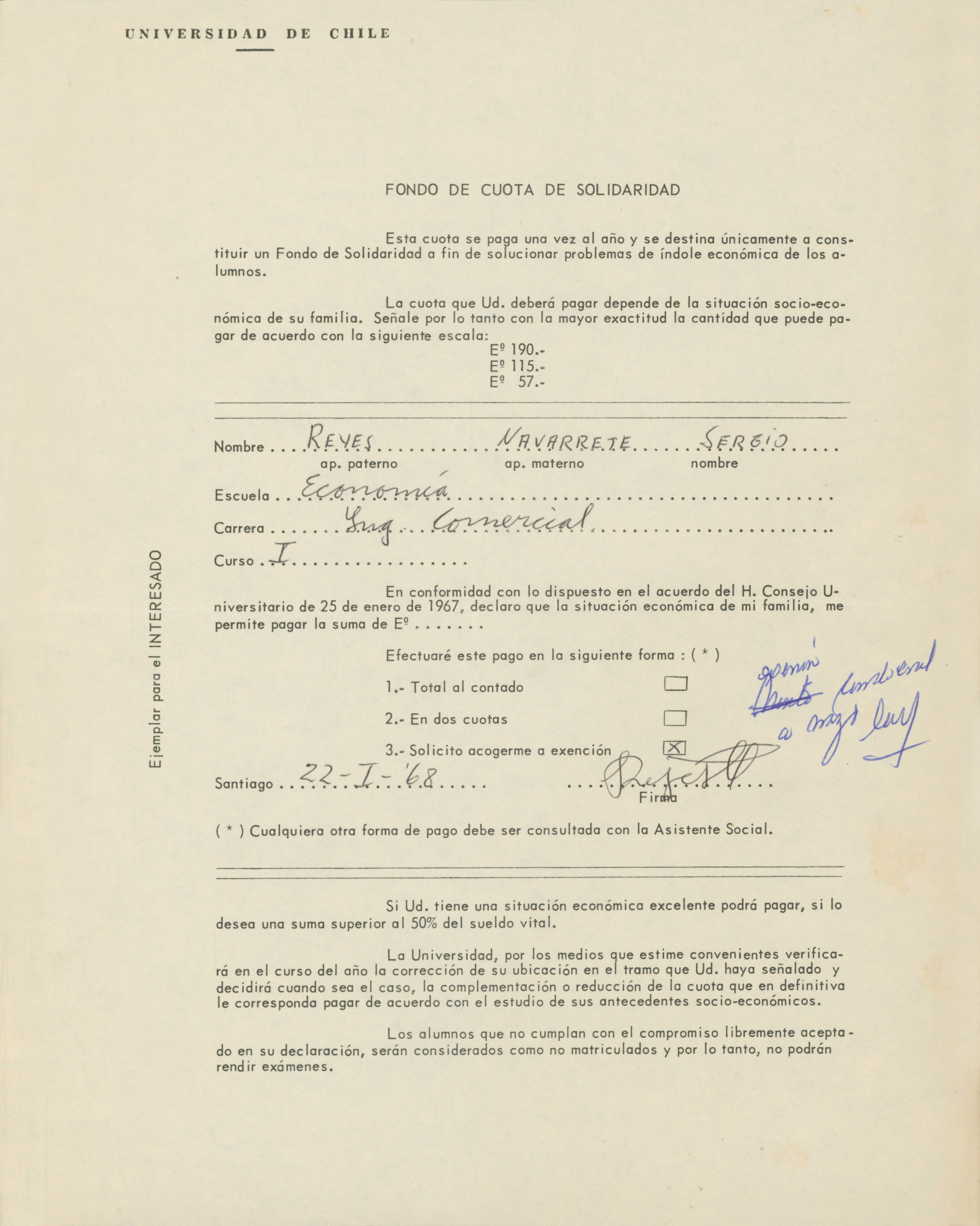 Certificado del Fondo de Cuota Solidaridad de la Universidad de Chile donde Sergio Reyes Navarrete estudiante de Ingeniería Comercial de la Escuela de Economía solicita la exención del pago de cuota.