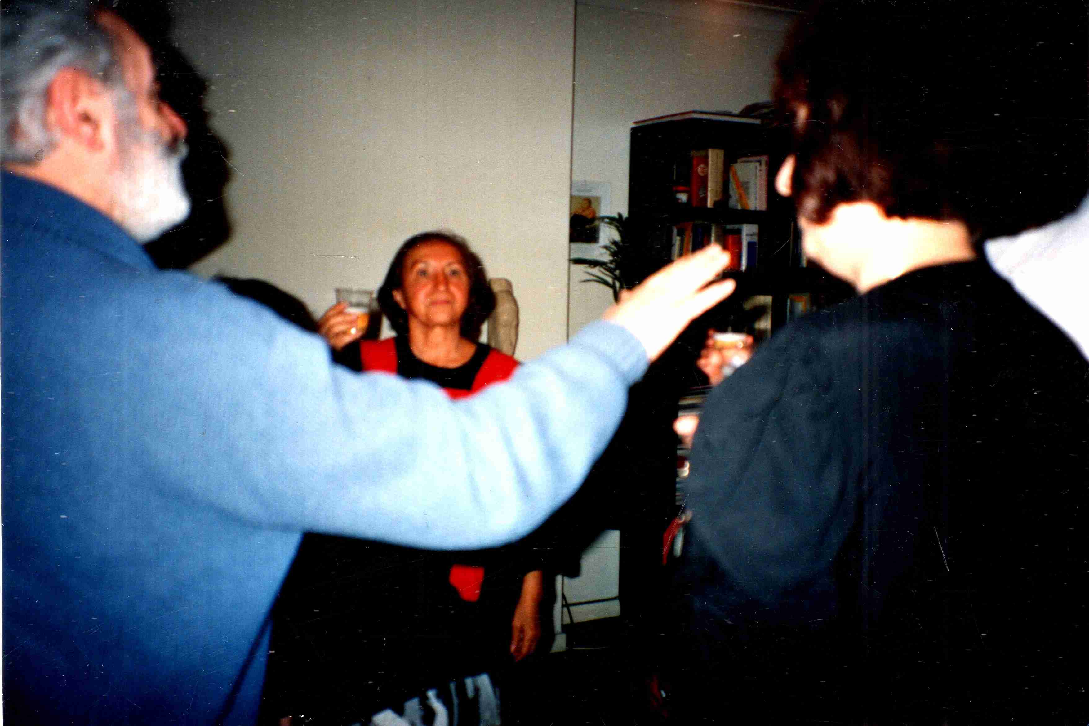 Fotografía de actividad de juicio a Augusto Pinochet, se ve a Magdalena haciendo un brindis junto a otras dos personas.