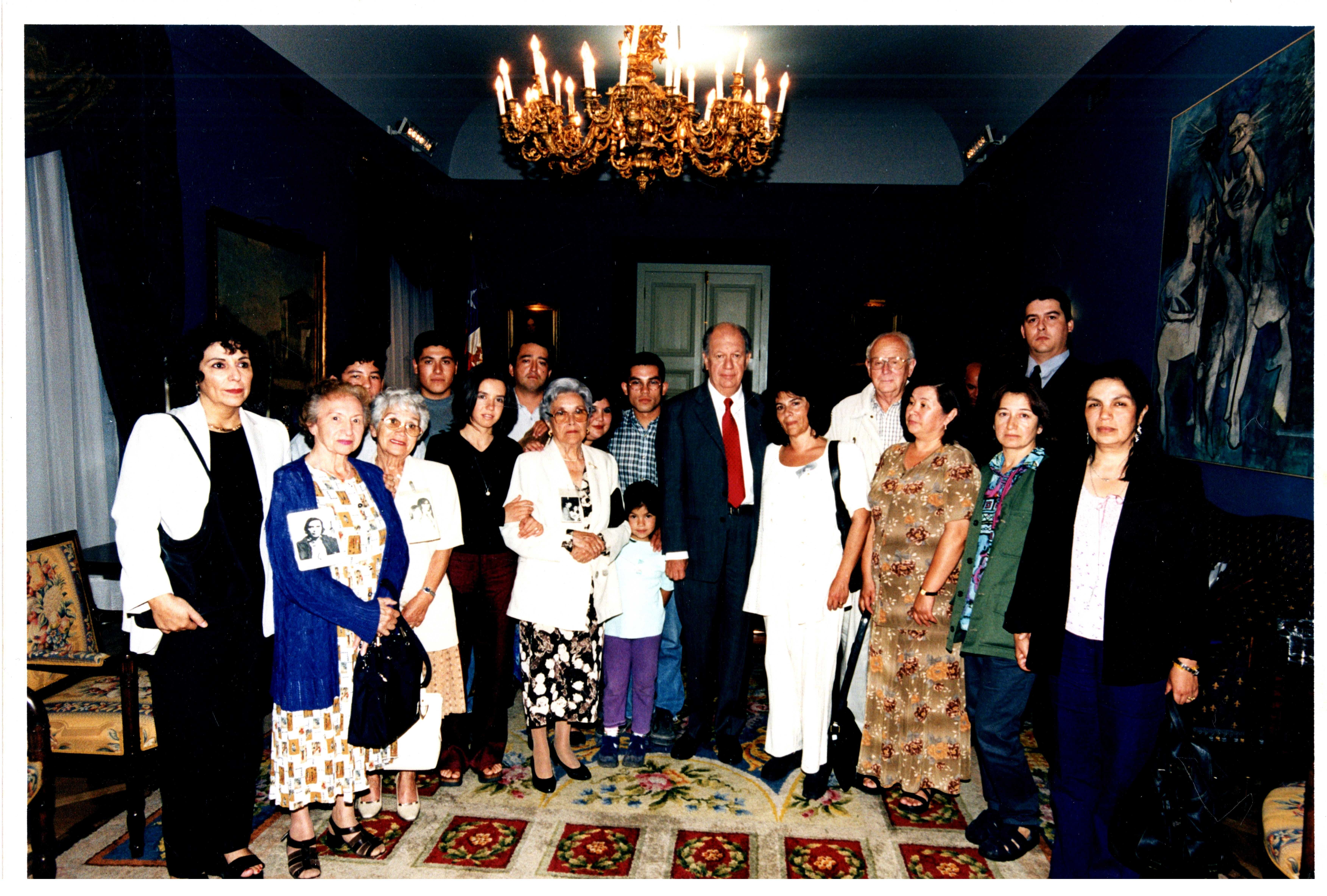 Reunión de Familiares de Detenidos Desaparecidos con el entonces Presidente de Chile, Ricardo Lagos Escobar, en la fotografía se encuentran de izquierda a derecha en primera fila; Erika Hennings, esposa de Alfonso Chanfreau; Magdalena Navarrete, madre de Sergio Reyes; Herminia Antequera, madre de Juan Carlos y Jorge Andrónicos.