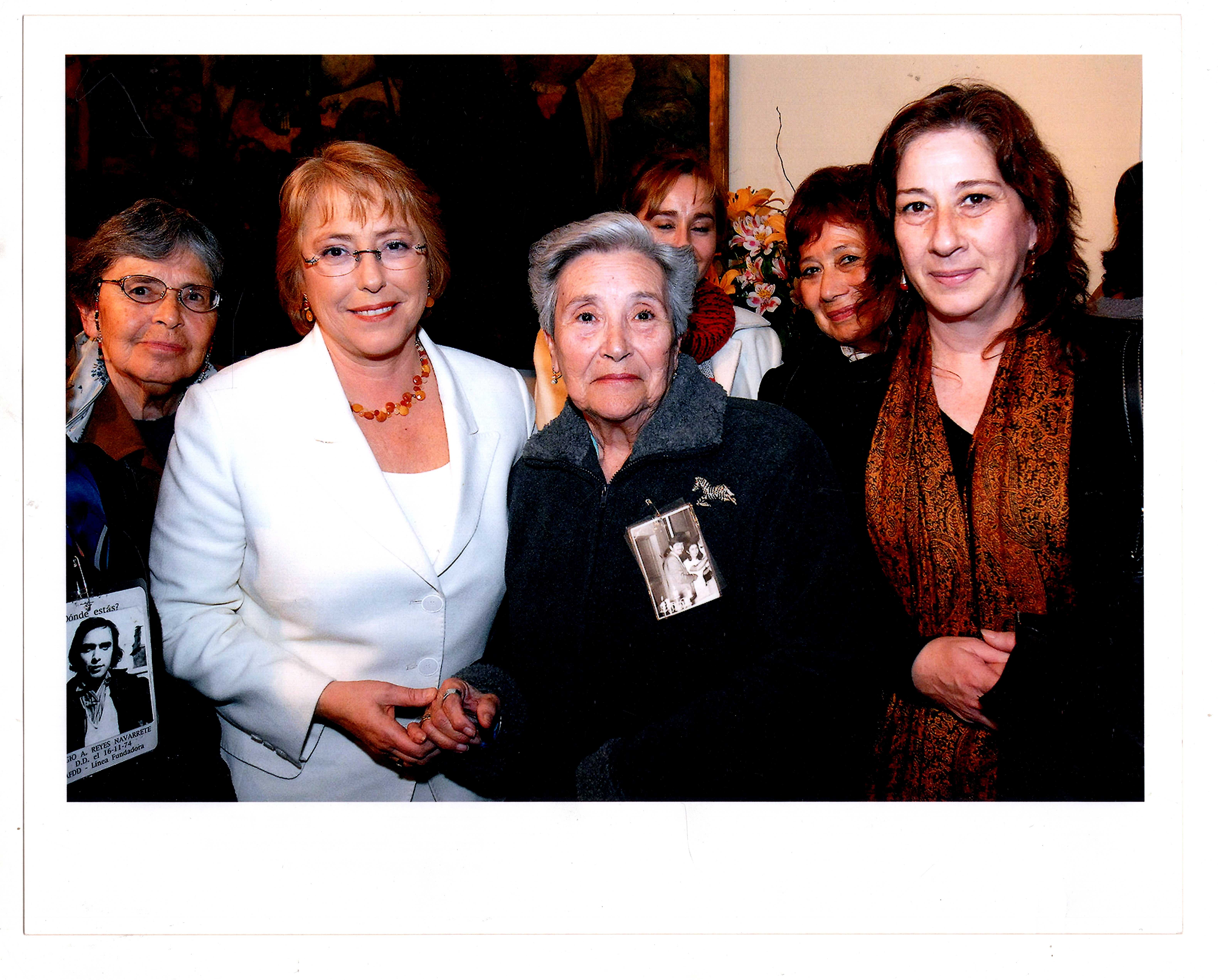 Fotografía en ceremonia de conmemoración del Día del Detenido Desaparecido, de 5 mujeres junto a la Presidenta de la República, Michelle Bachelet Jeria.