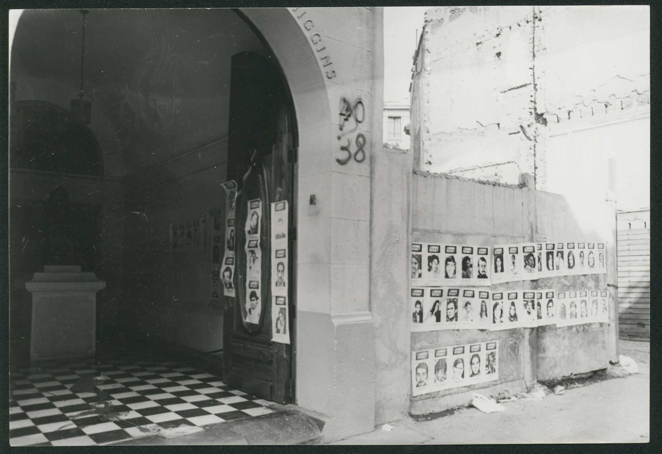 Manifestación en frontis de Londres 38 en donde se intervino con fotografías de detenidos desaparecidos.