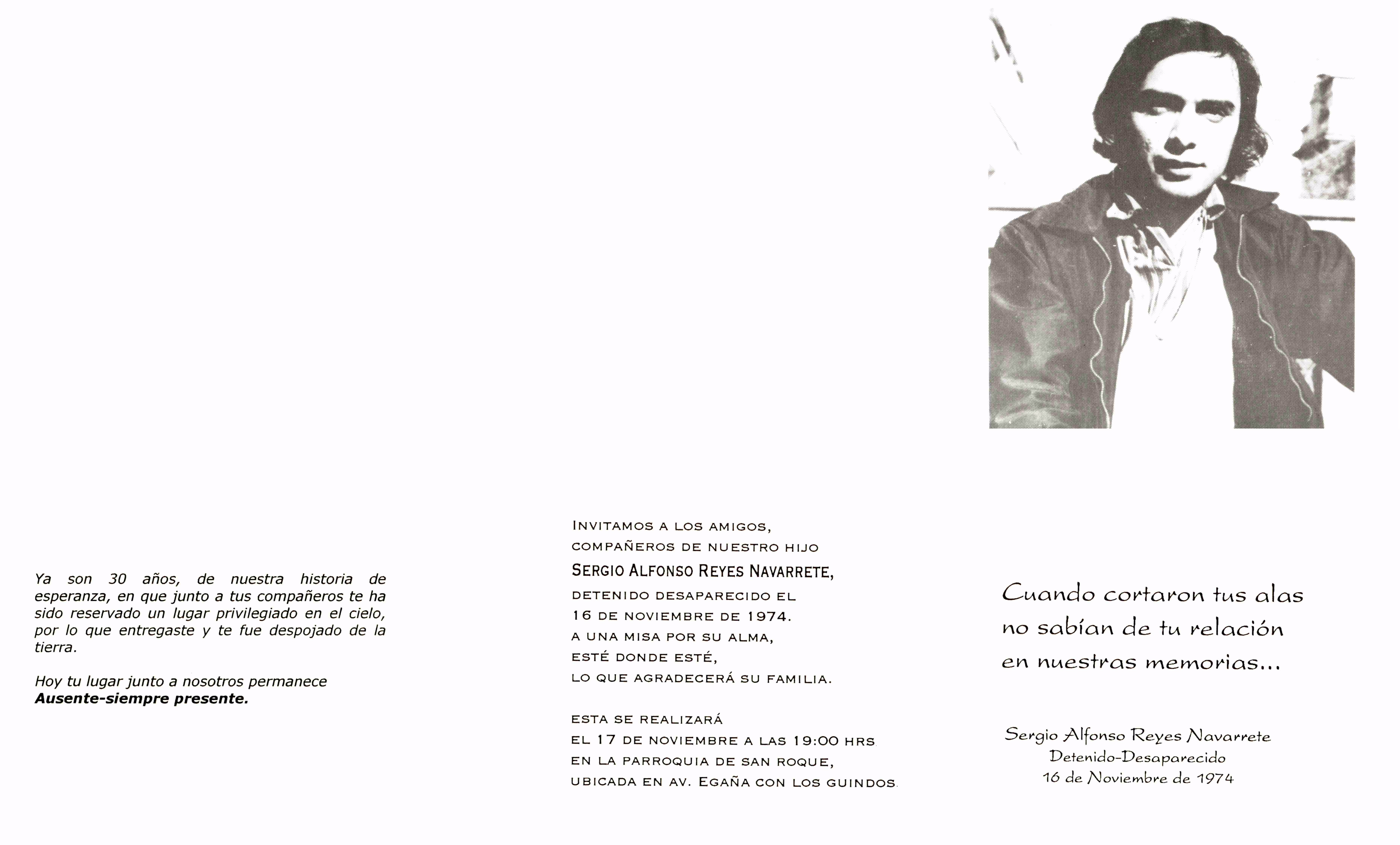Invitación a misa en conmemoración de la desaparición de Sergio Navarrete a realizarse el sábado 17 de noviembre de 2004 a las 19.00 horas en la parroquia de San Roque.